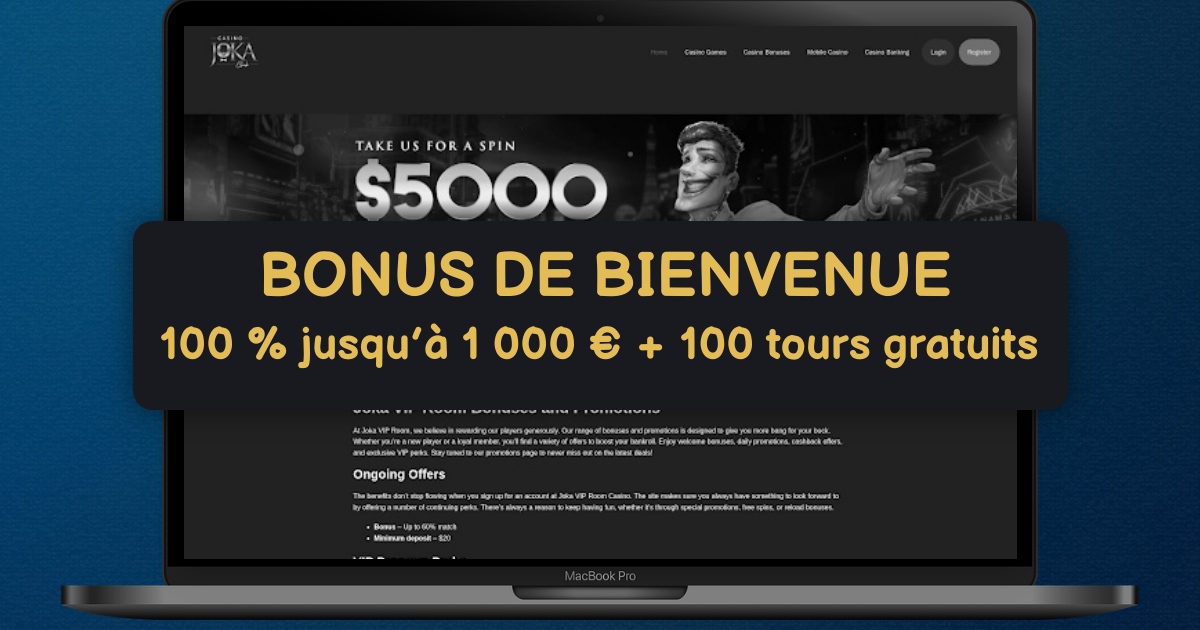 Joka VIP Casino accueille les joueurs de France avec un bonus de bienvenue jusqu’à 1000 € et 100 tours gratuits. Le bonus est soumis à une mise de 35x sur le montant reçu et les gains des tours sont soumis à 30x. Le site est opéré sous licence de Curaçao eGaming, avec sécurité SSL et contrôles KYC. Vous profitez d’un paiement rapide, d’un casino mobile fluide et d’un service client en français. La ludothèque couvre machines à sous, jeux de table, live casino et jackpot progressif. Les studios incluent NetEnt, Pragmatic Play, Play’n GO et Evolution pour une expérience fiable. Les dépôts en euros se font par Visa, Mastercard, virement, Skrill, Neteller, Paysafecard et Apple Pay. Les retraits sont traités en 24 heures après vérification du compte. L’interface s’adapte aux mobiles iOS et Android via navigateur, sans téléchargement, avec notifications web. Les limites et les outils de jeu responsable sont disponibles. Rejoignez Joka VIP Casino pour explorer des tournois, des bonus réguliers et un programme VIP. La France aime la simplicité et la transparence. Nous aussi.
